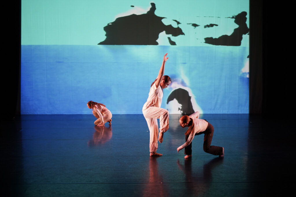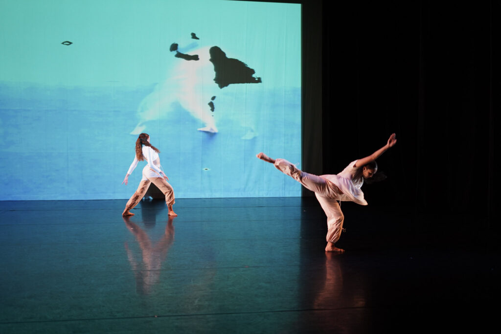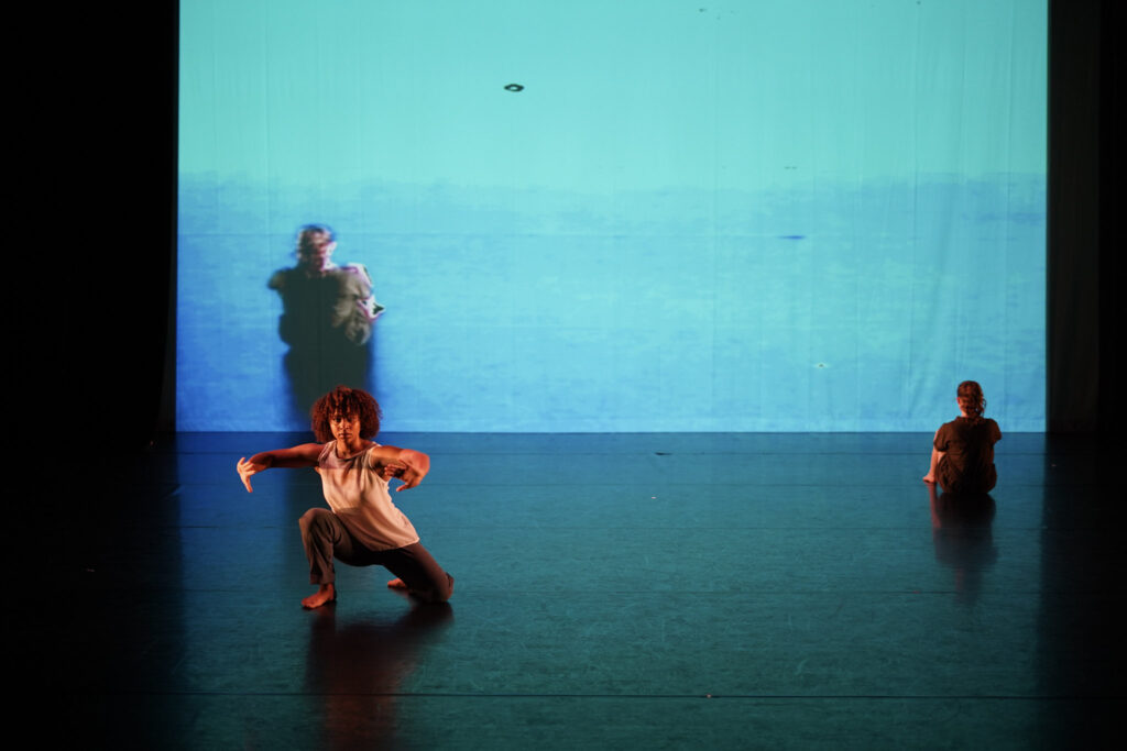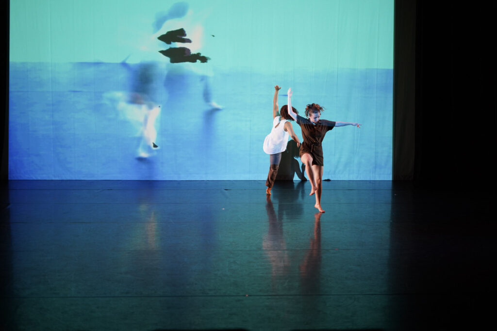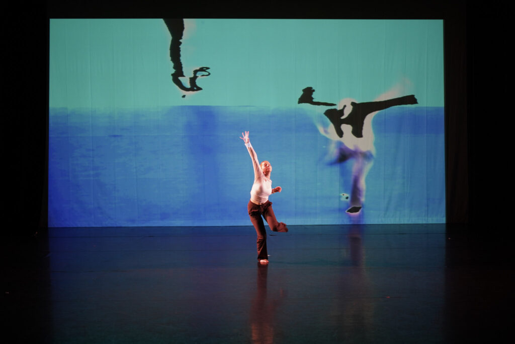 The projections were created using Isadora live projection software in conjunction with the Tricaster computer and streaming camera. My creative methodology often involves using projection as a choreographic collaborator—technology as an equal voice in the narrative development of a work. However, the architectural constraints of the EJM proscenium space required a rethinking of my process. Rather than an evolving visual landscape, I opted for a singular, cohesive projection “look” across the full 17-minute piece. This decision was also influenced by student feedback during previous projection workshops, where several remarked that “projections take away from the dance.” I approached this as a design challenge: how might projection amplify rather than compete with the live body?